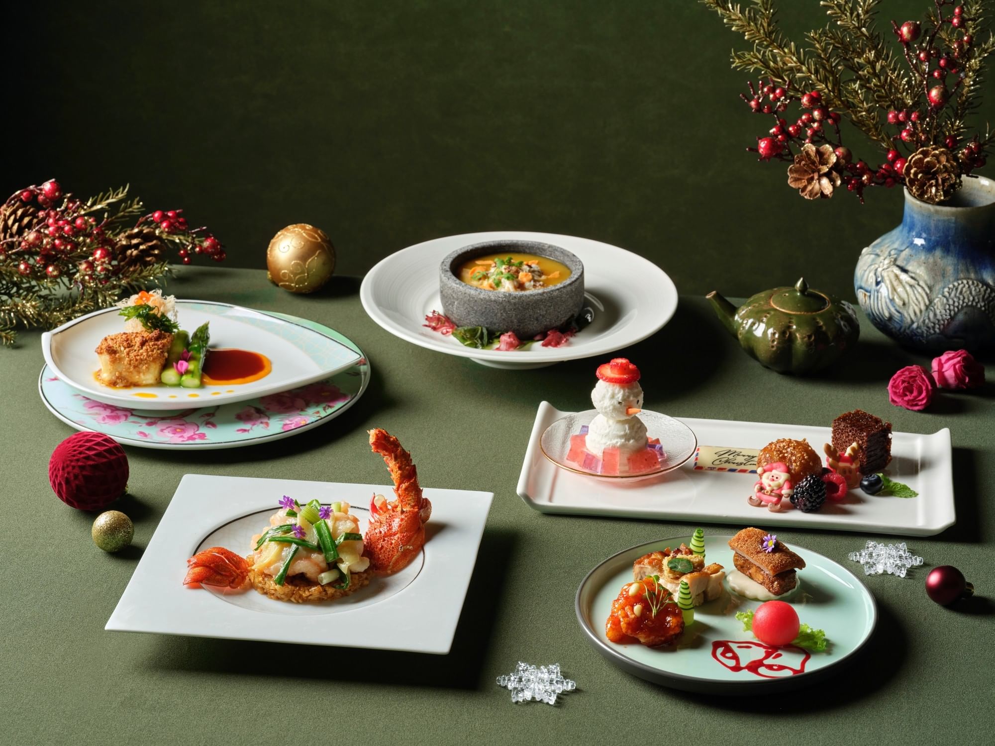 At Jade, savour Chinese classics reimagined with a festive twist. Highlights include Traditional Roast Suckling Pig with Foie Gras and Pancake, and Snowman-shaped Coconut Ice with Caramelised Banana and Brown Sugar Cake.