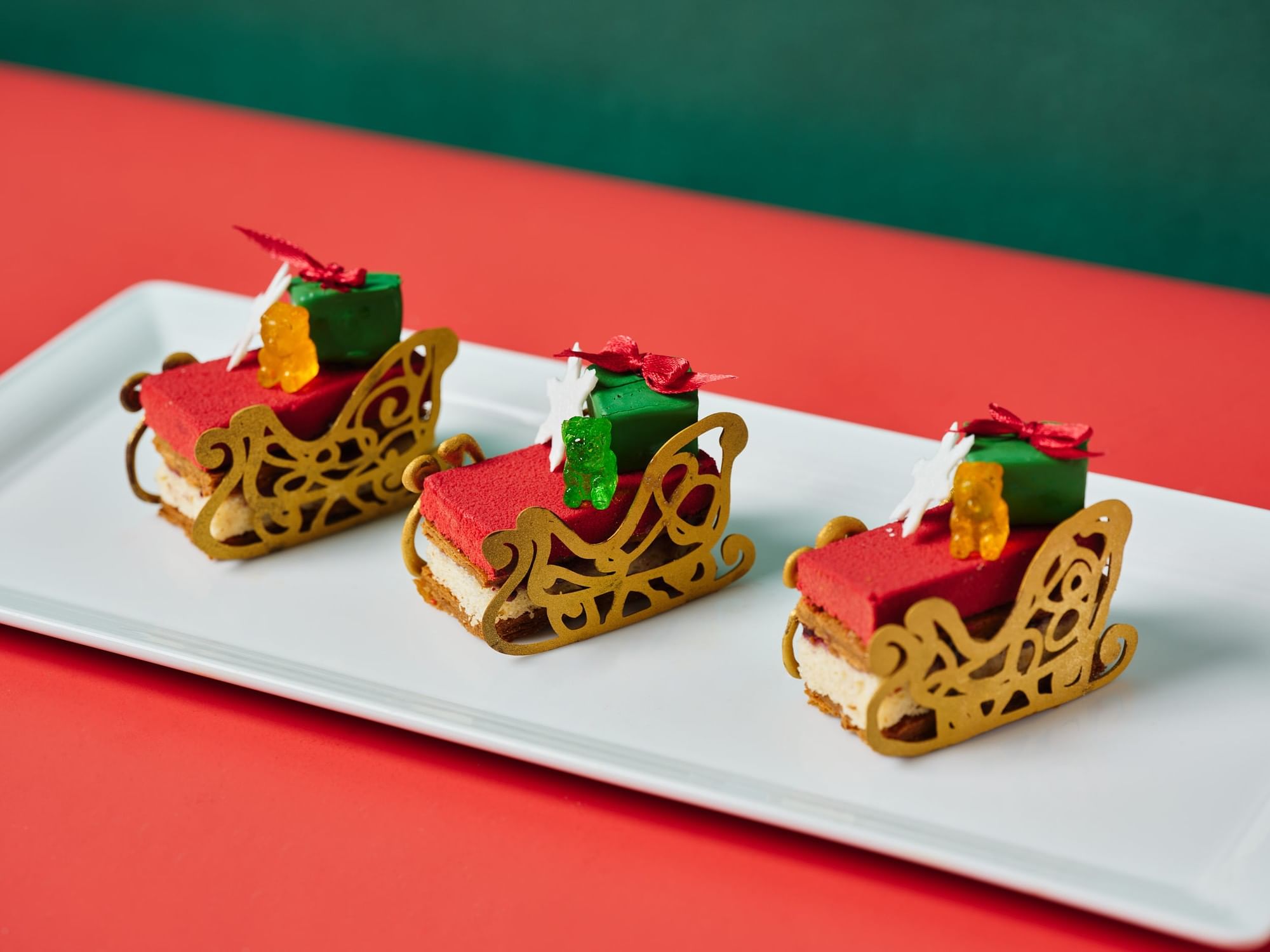 Share a memorable moment with loved ones while enjoying an elegant spread of festive delights, featuring Vanilla Anglaise Mousse, Mille-feuille, Almond Joconde, Gingerbread Biscuits, Pistachio Macaron with Pork Pâté, Sydney Rock Oysters, Truffled Egg and Cucumber Sandwich and Pulled Turkey with Cranberry. Paired with our Plain and Mixed Spiced Scones, served with Hibiscus Red Current Jam and Cream.